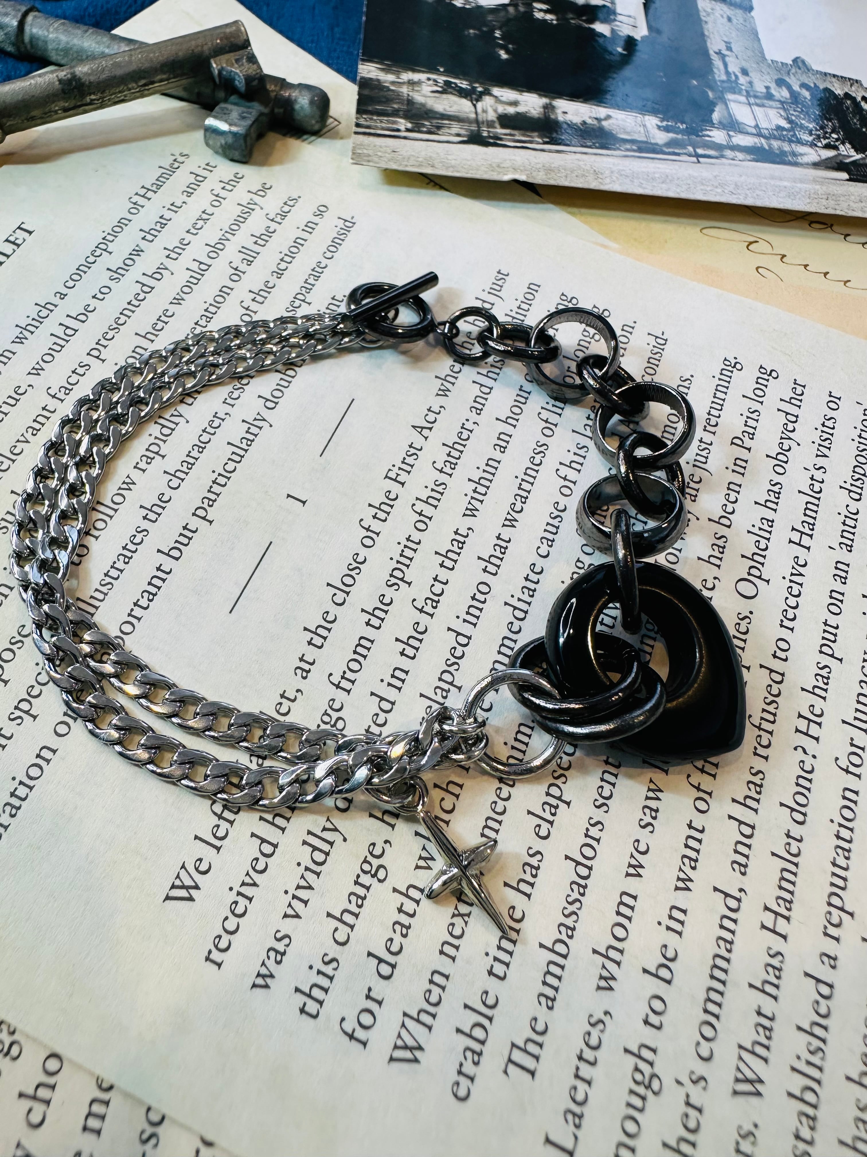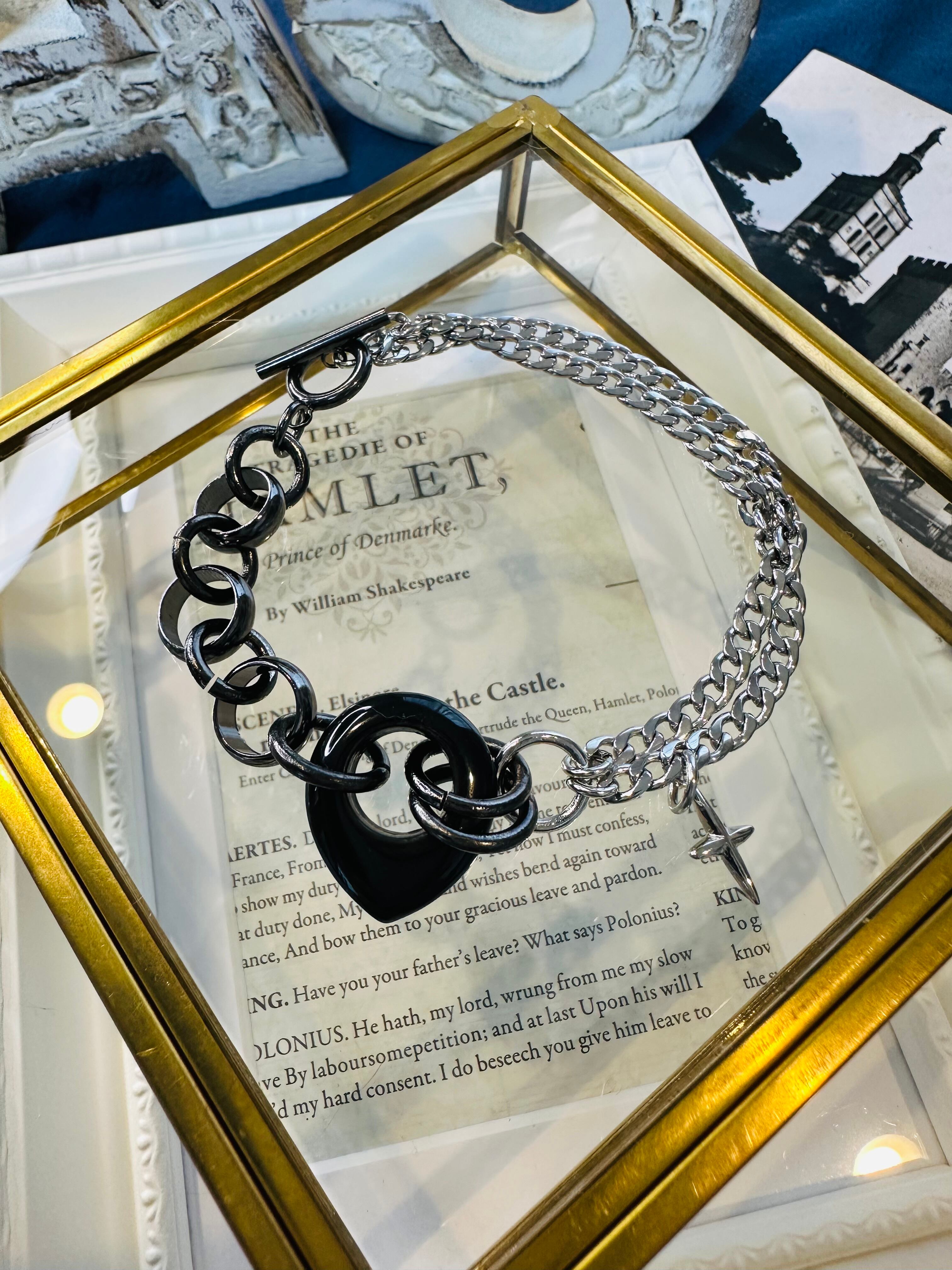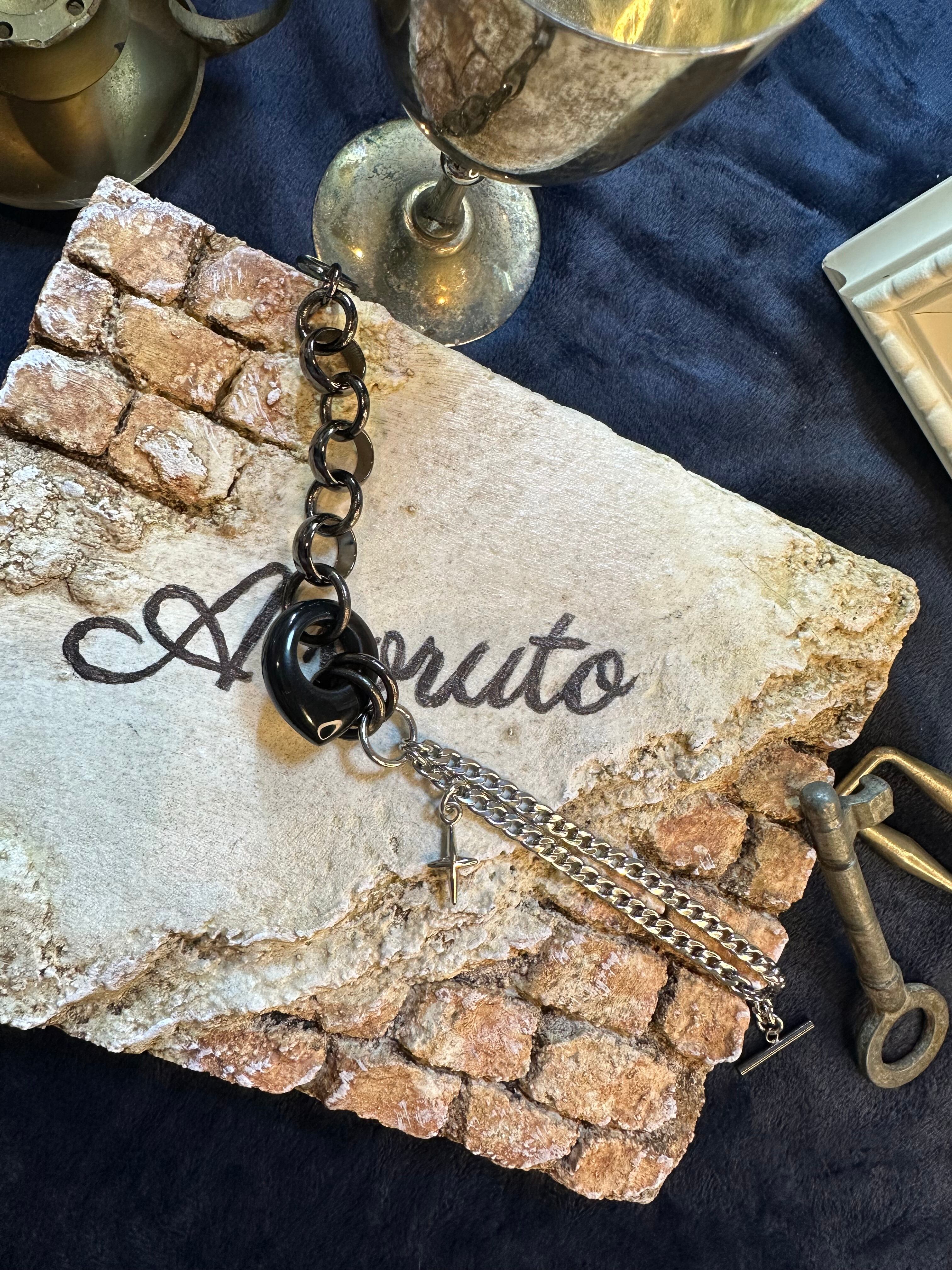 大きめなブラックオニキスとメタル系のサークルパーツ、クロスのチャーム、ステンレスのチェーンを繋げて作りました。