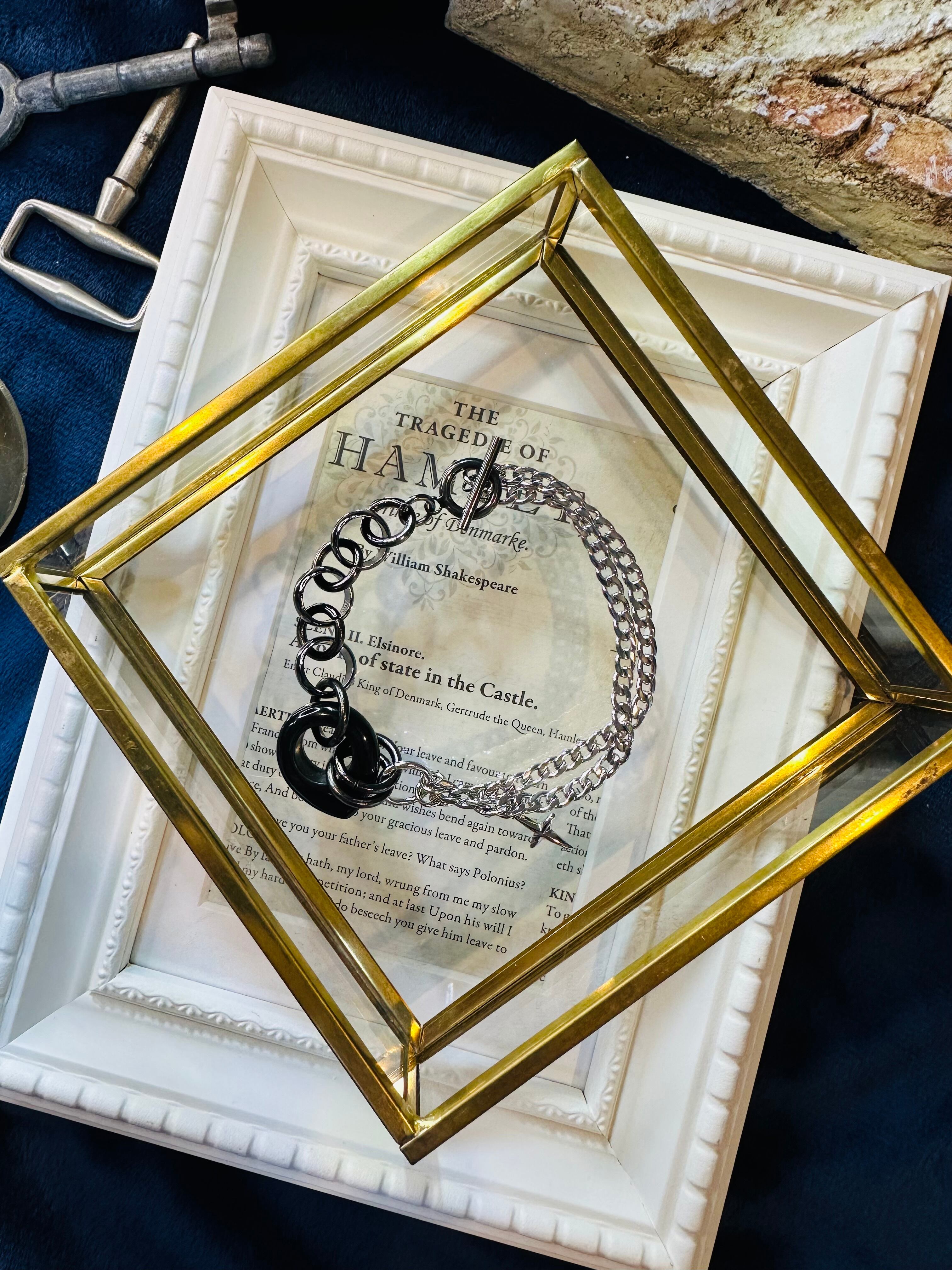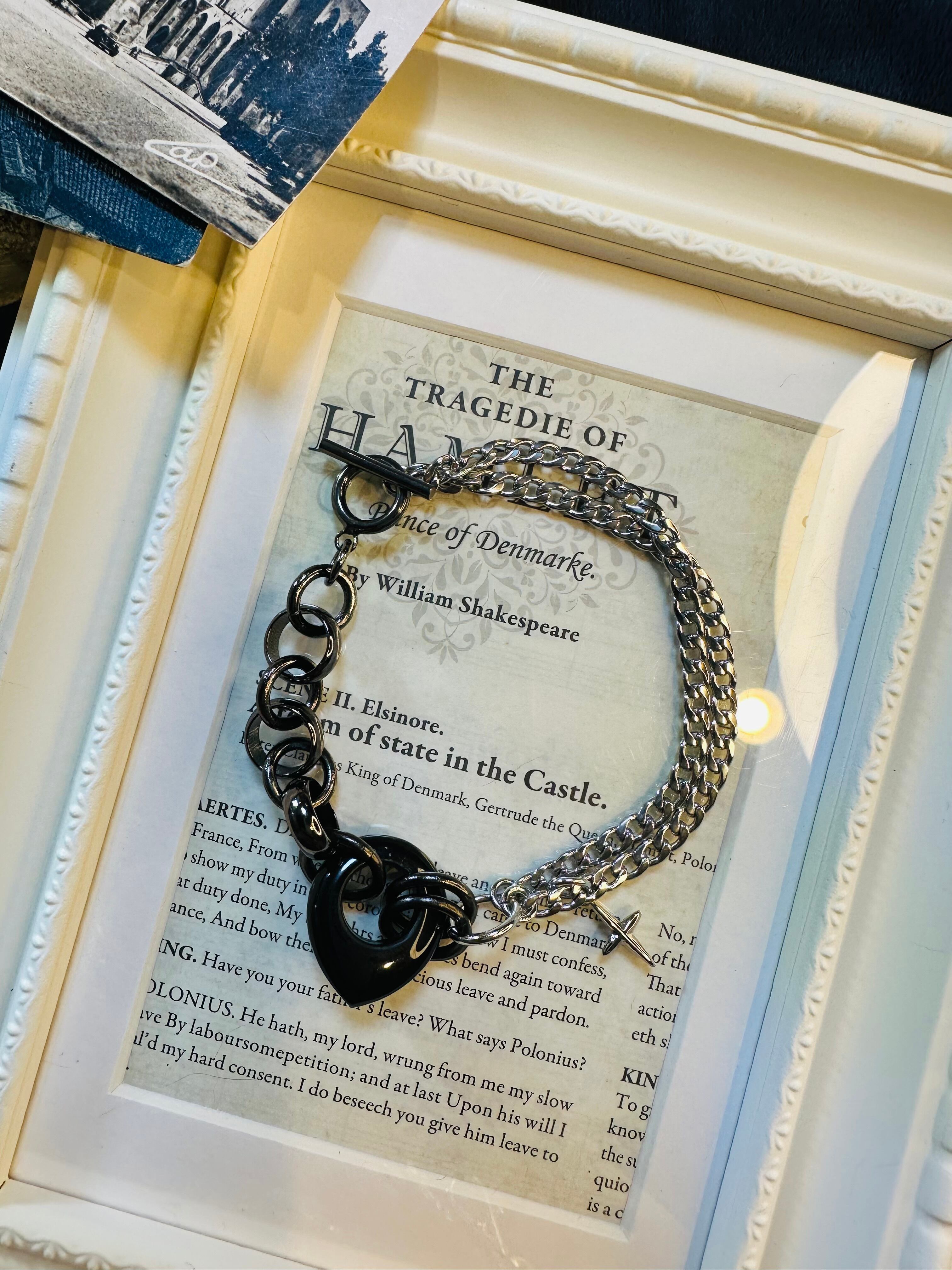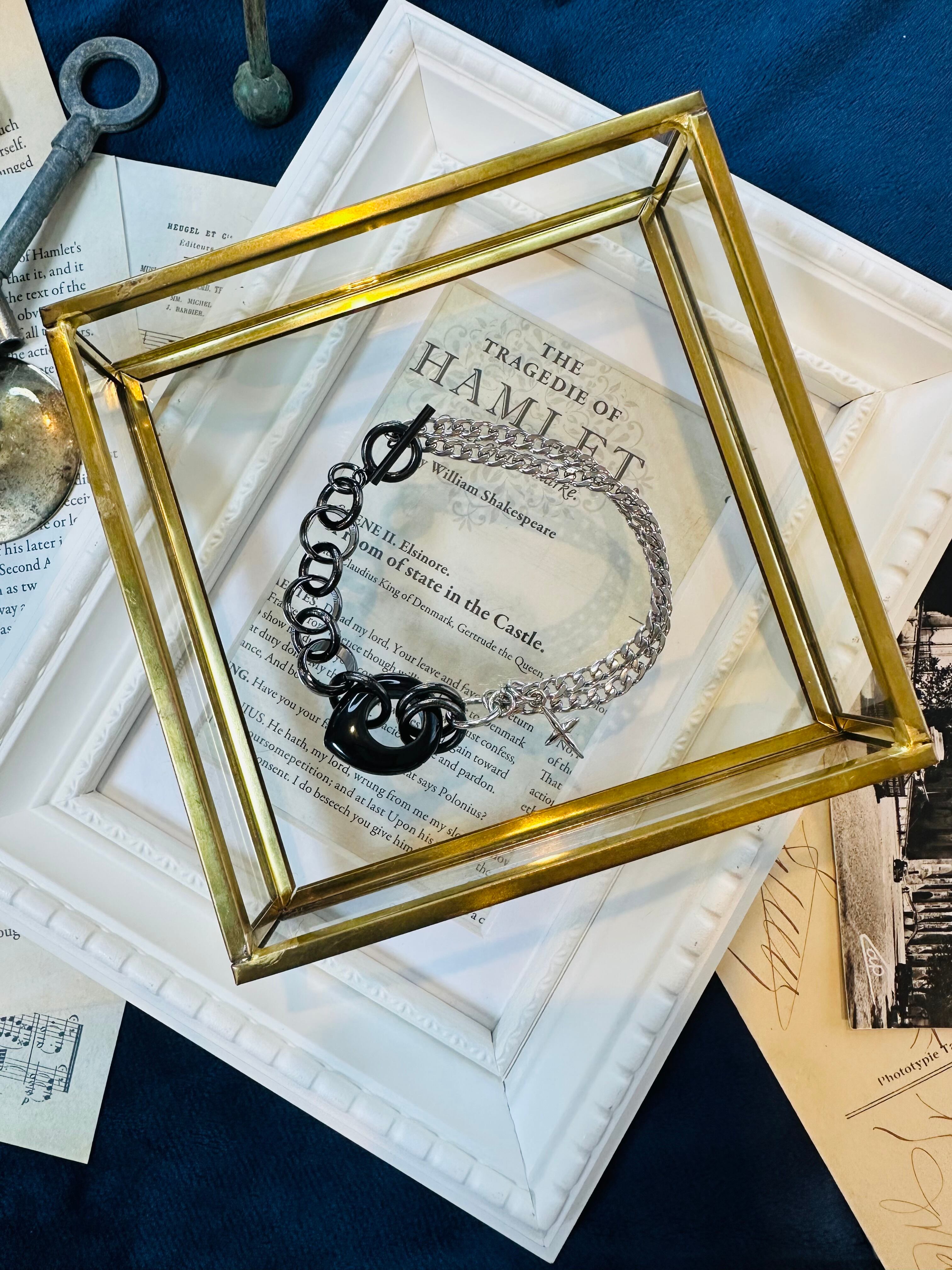 大きめなブラックオニキスとメタル系のサークルパーツ、クロスのチャーム、ステンレスのチェーンを繋げて作りました。