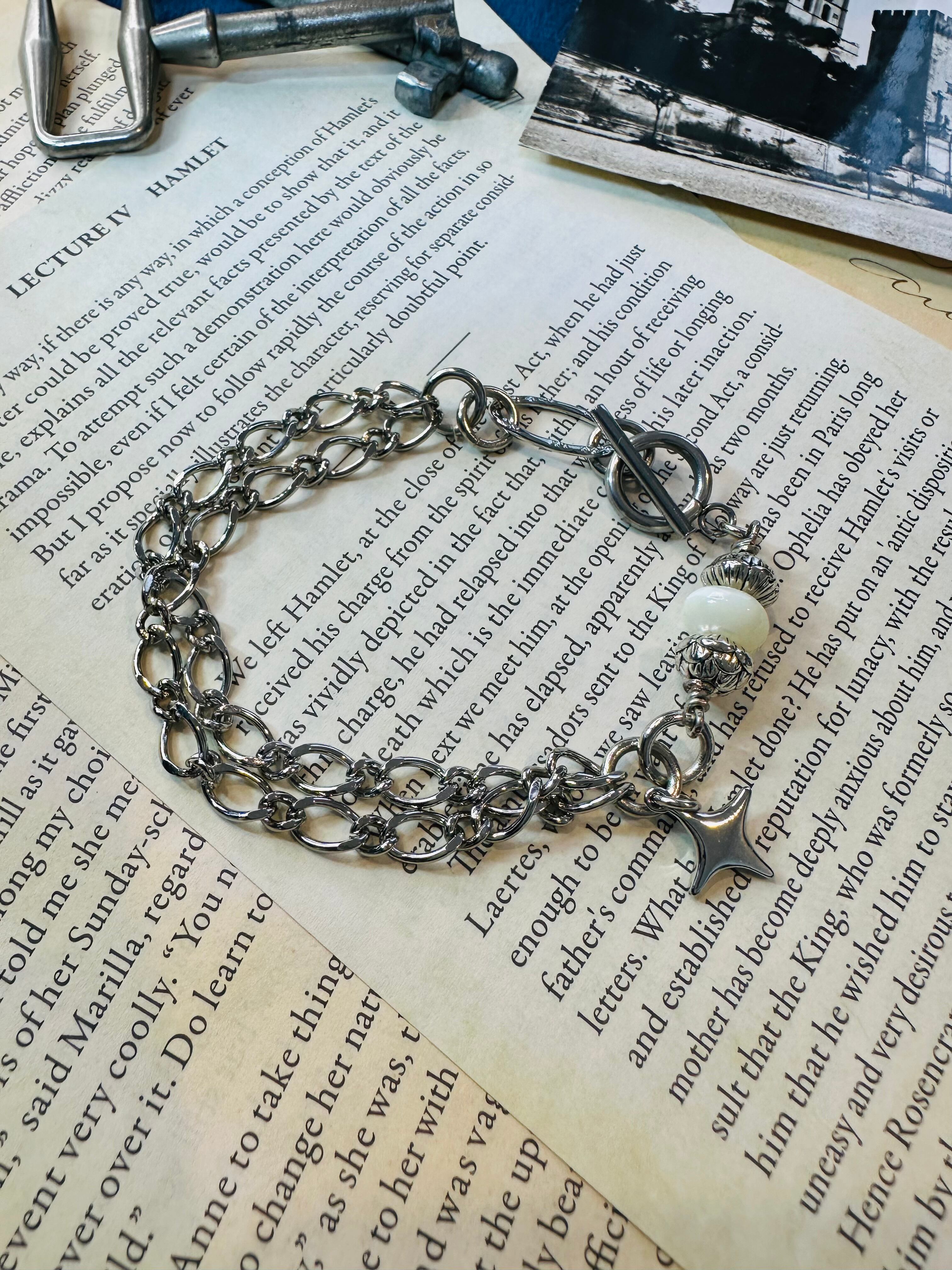 メタルの蓮ビーズ、シェルビーズ、メタルチャームやチェーンを組み合わせて作りました。