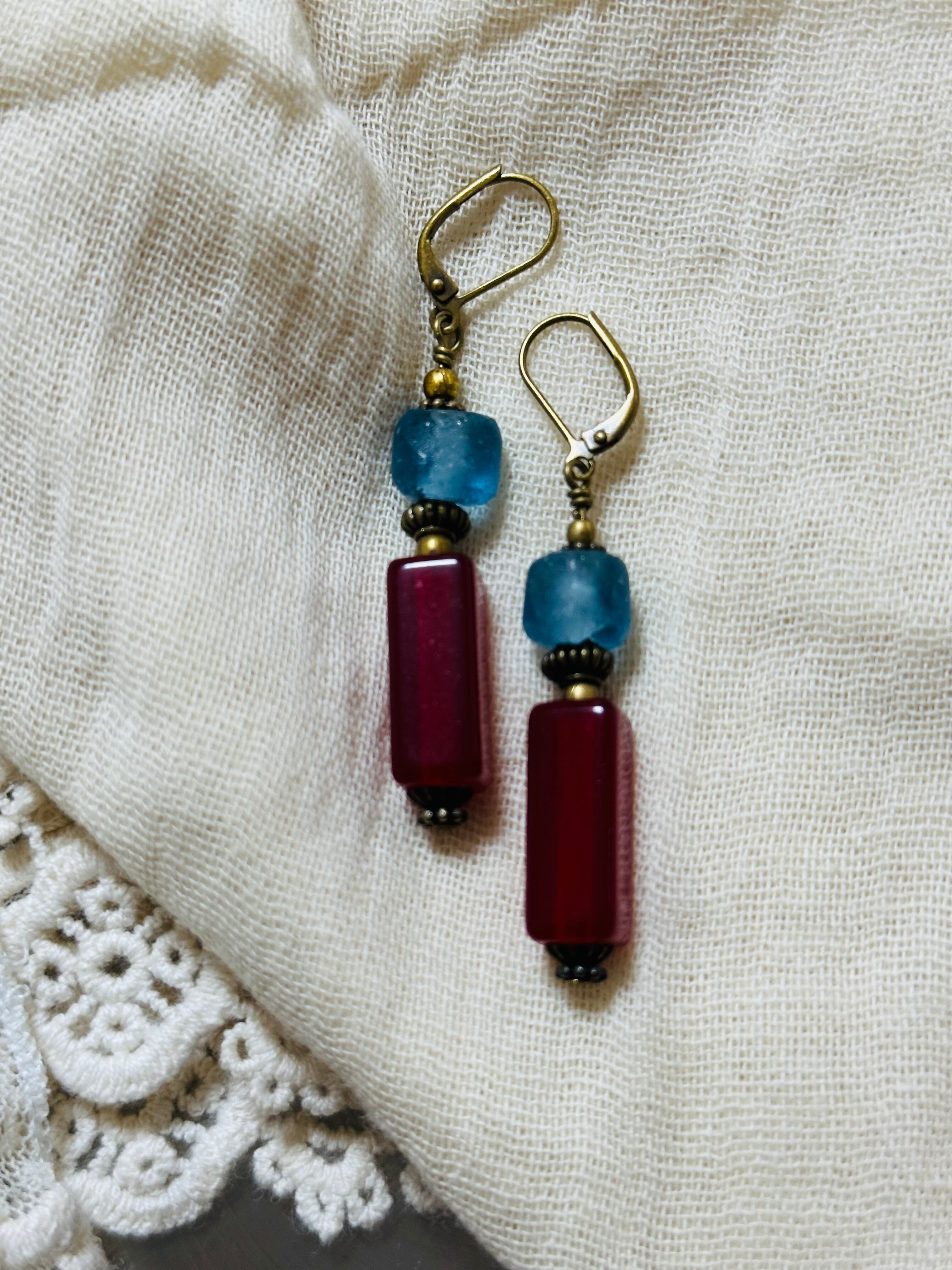 ドイツ製アクリルレクタングル(チェリーレッド)とガラスビーズとブラスビーズを繋げたピアスで、アンティークゴールドのフレンチフックを使用しています。