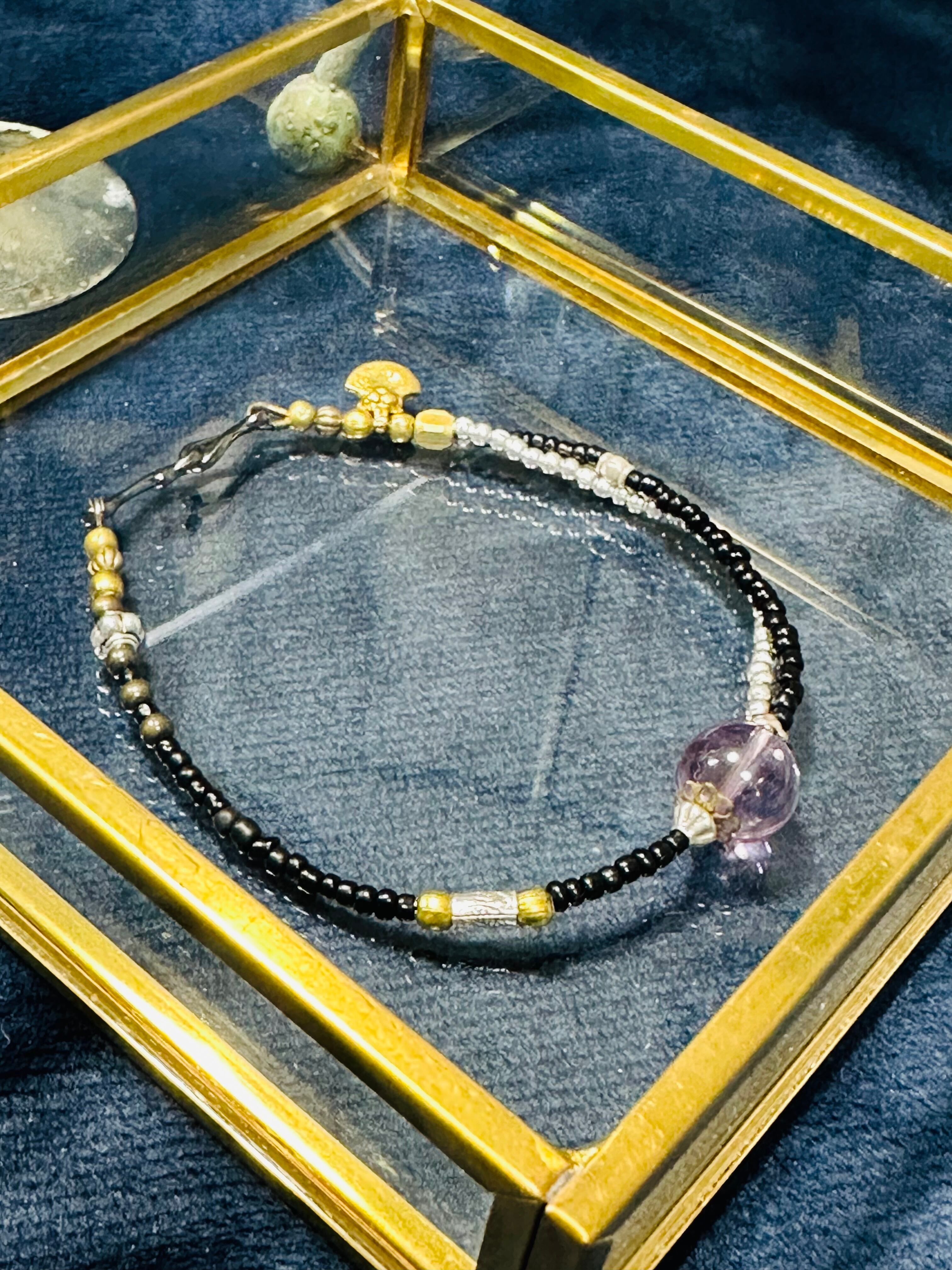 ラベンダーアメジスト(AAA)と黒のジャワビーズ、メタルビーズ、カレンシルバーを繋いで作ったブレスレットです。