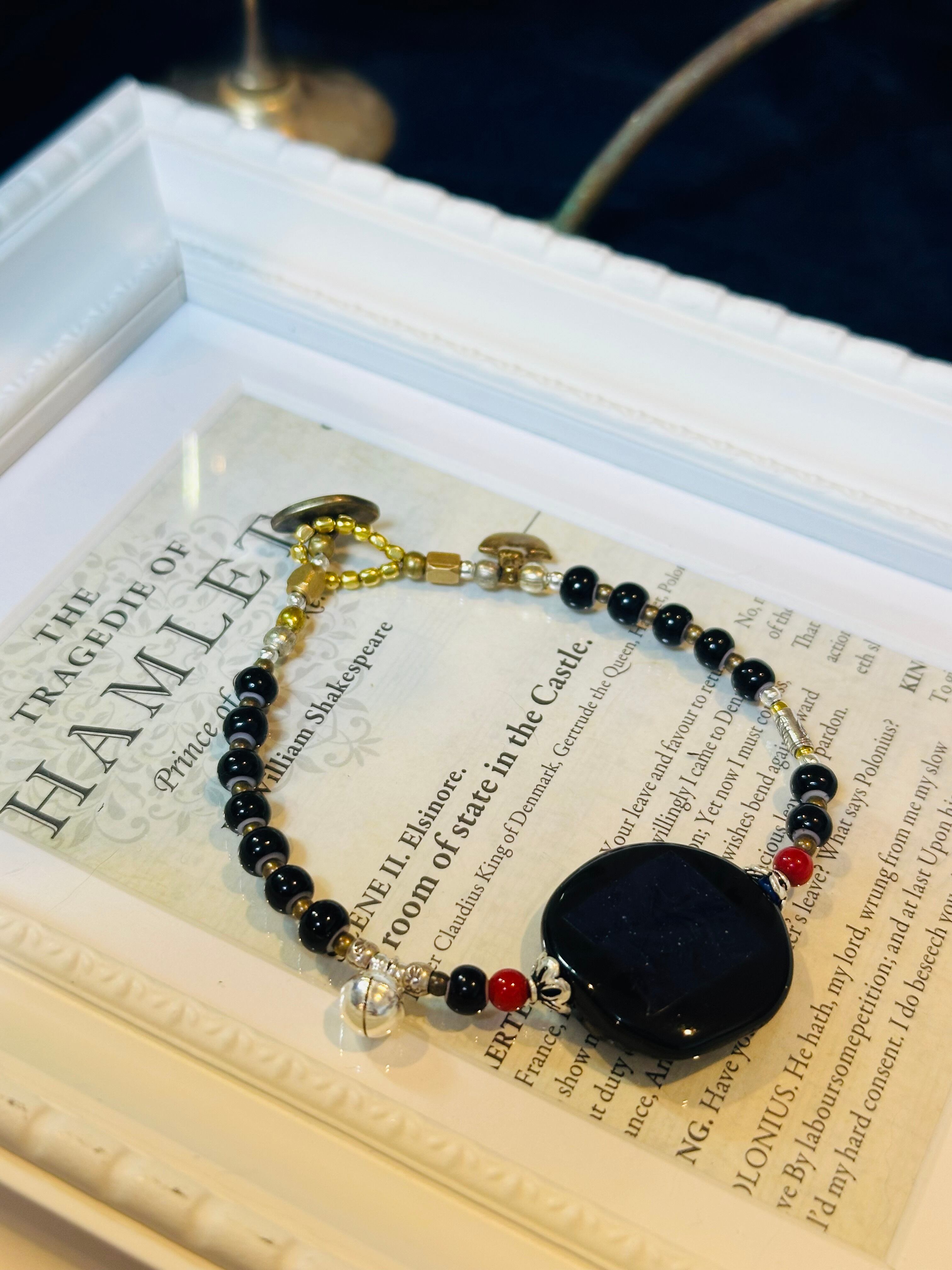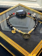 紺色のボタンと黒のホワイトハーツ、カレンシルバーなどを繋げて作ったブレスレットです。