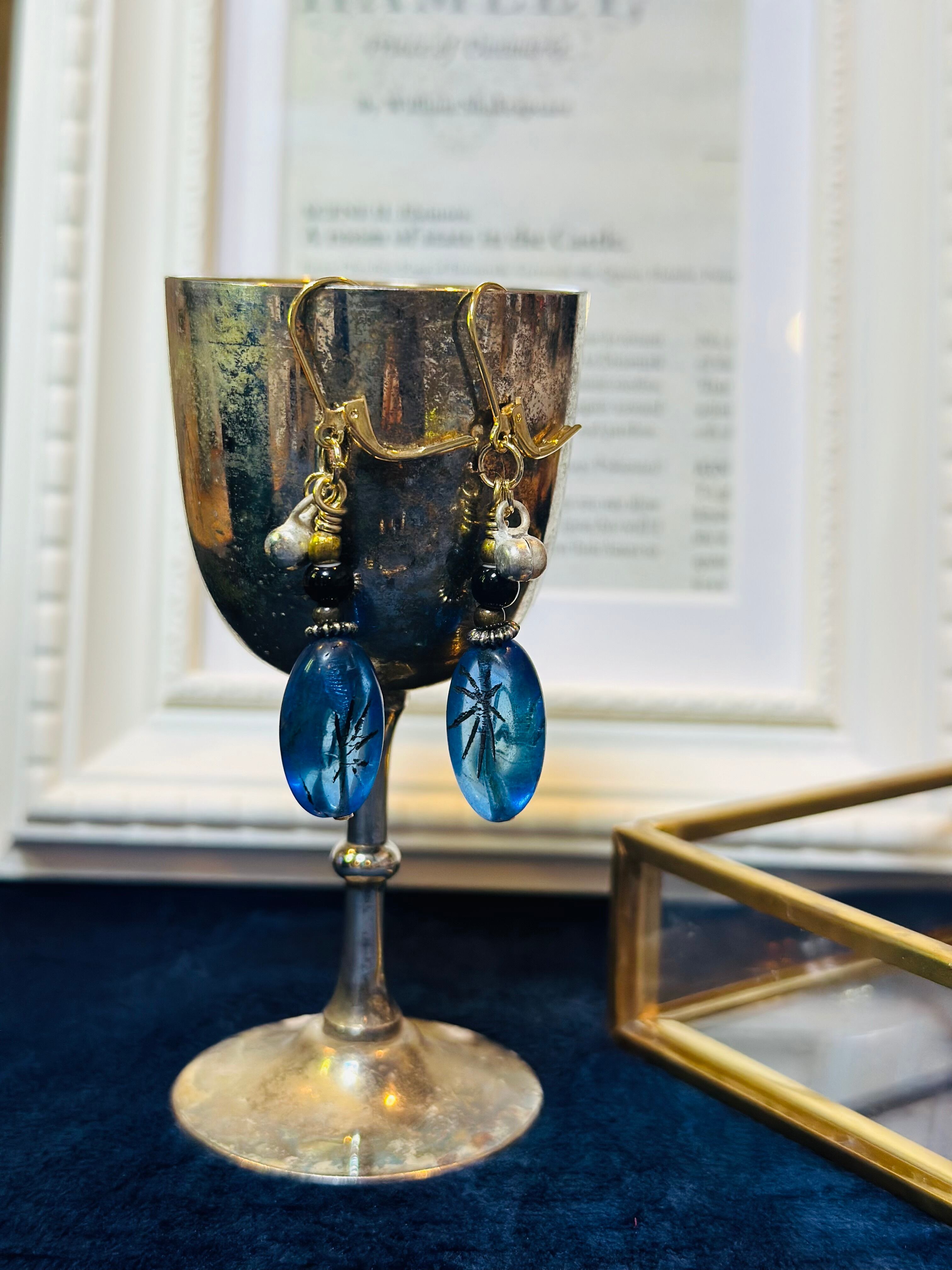 チェコビーズとホワイトハーツ(黒)メタルビーズなどを繋げて作ったピアスです。