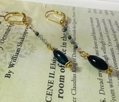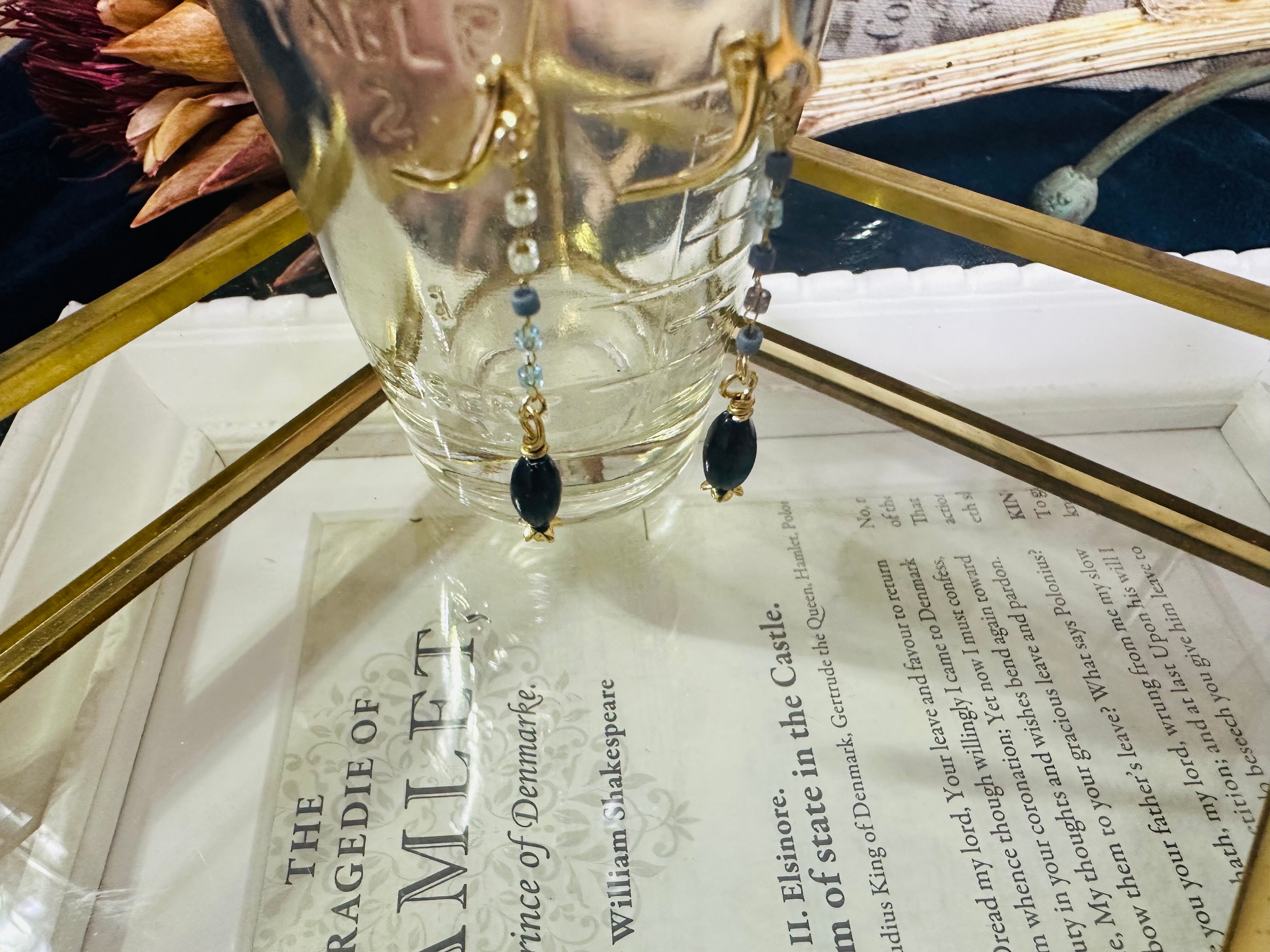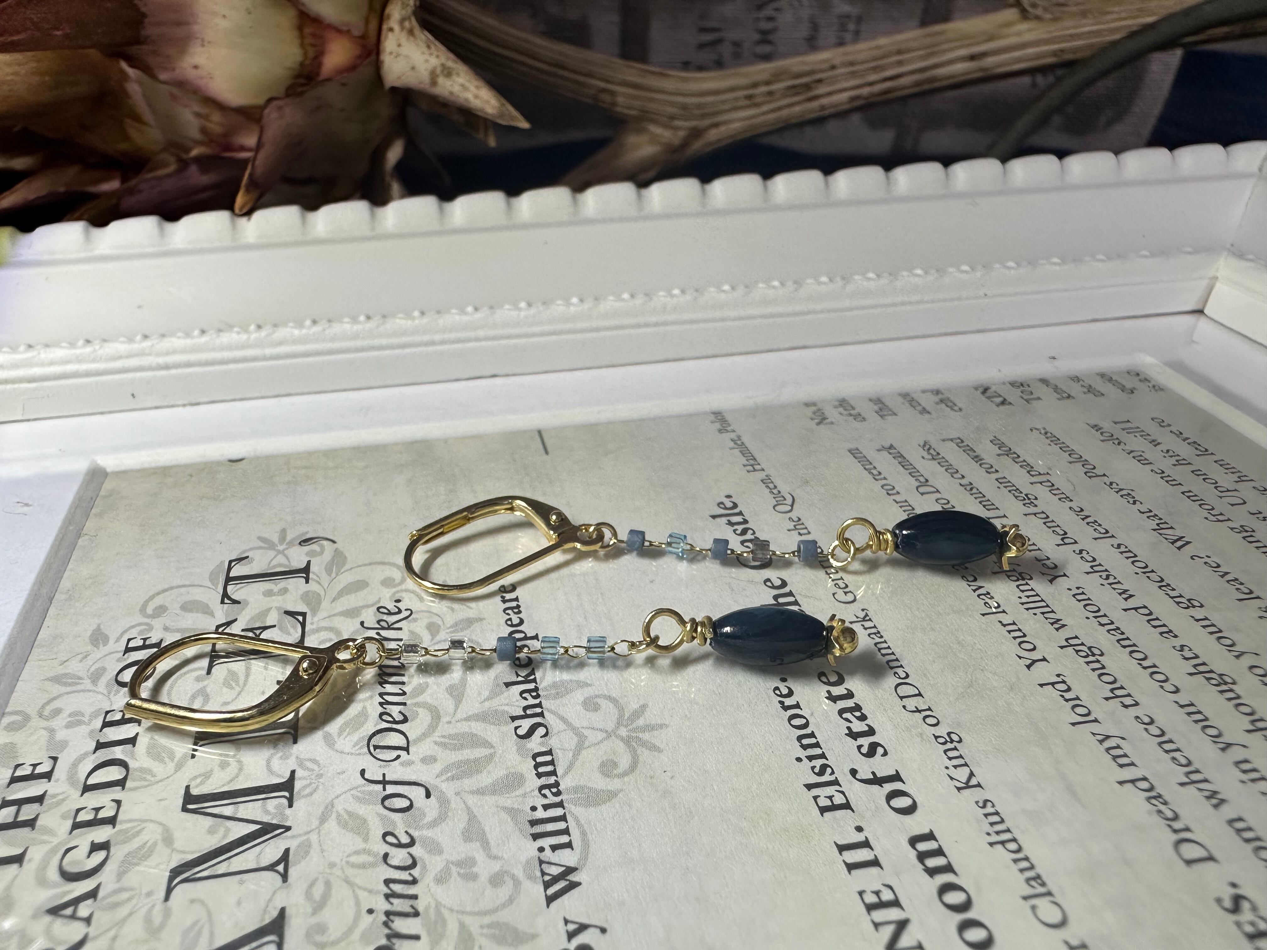 青い色のシーシェルビーズとランダムな色で繋がっているチェーン(水色系)を繋げて作ったピアスです。