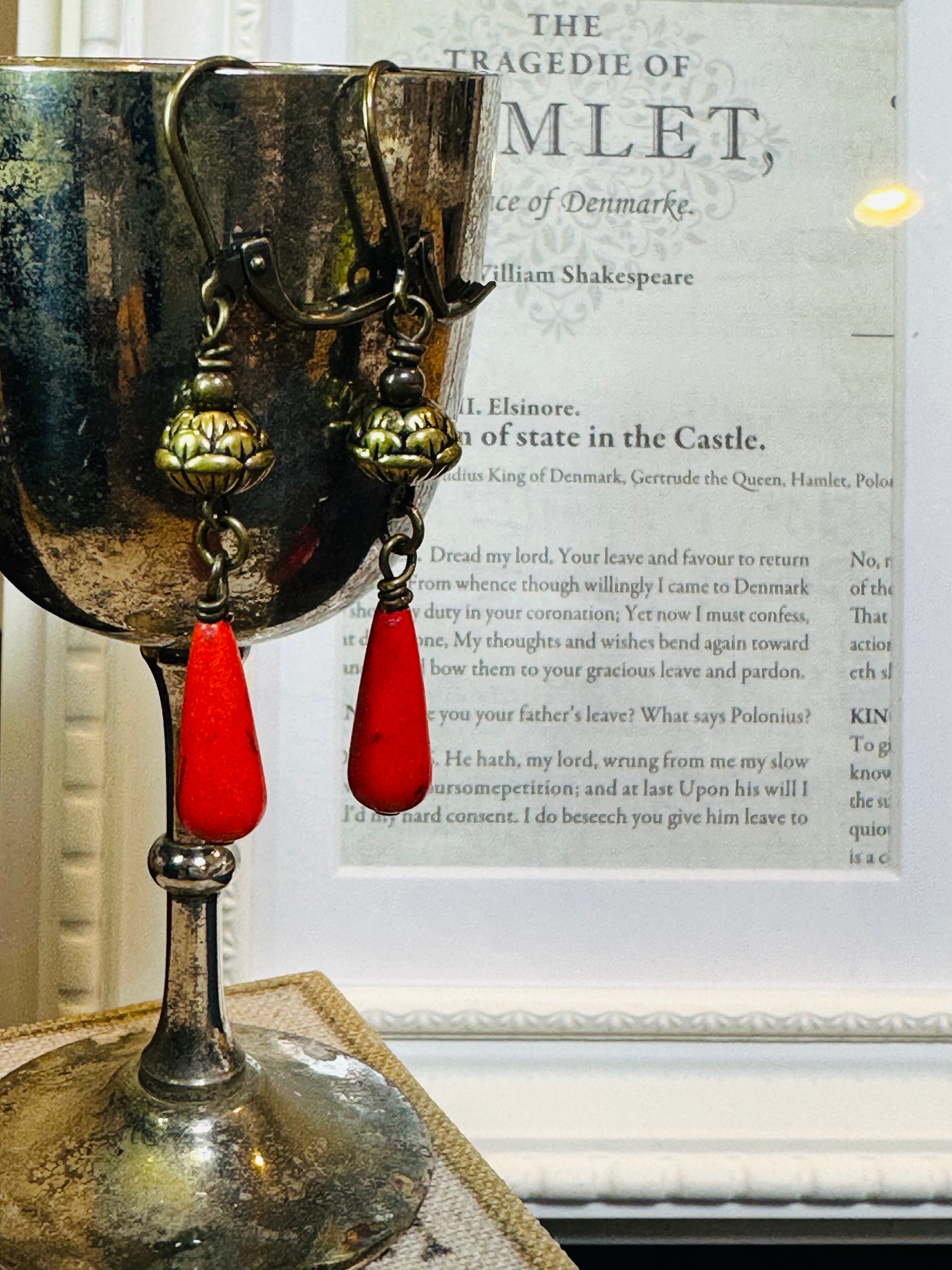 赤い合成ターコイズと蓮のメタルビーズを繋げて作ったピアスです。