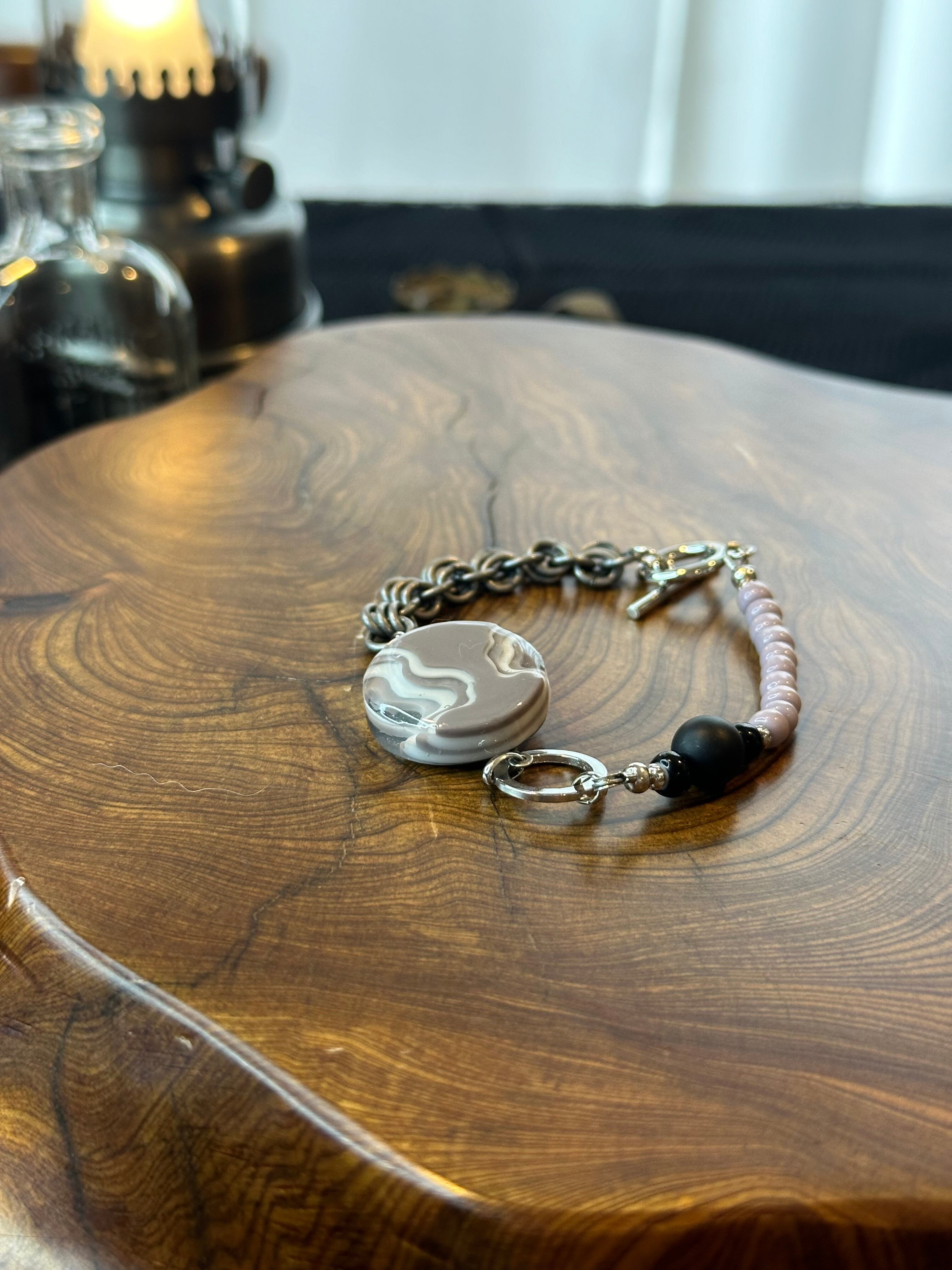 フロストオニキスとヴィンテージヴェネチアンビーズ、ホワイトハーツ、エポキシ樹脂のパーツを繋げて作ったブレスレットです。