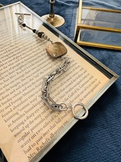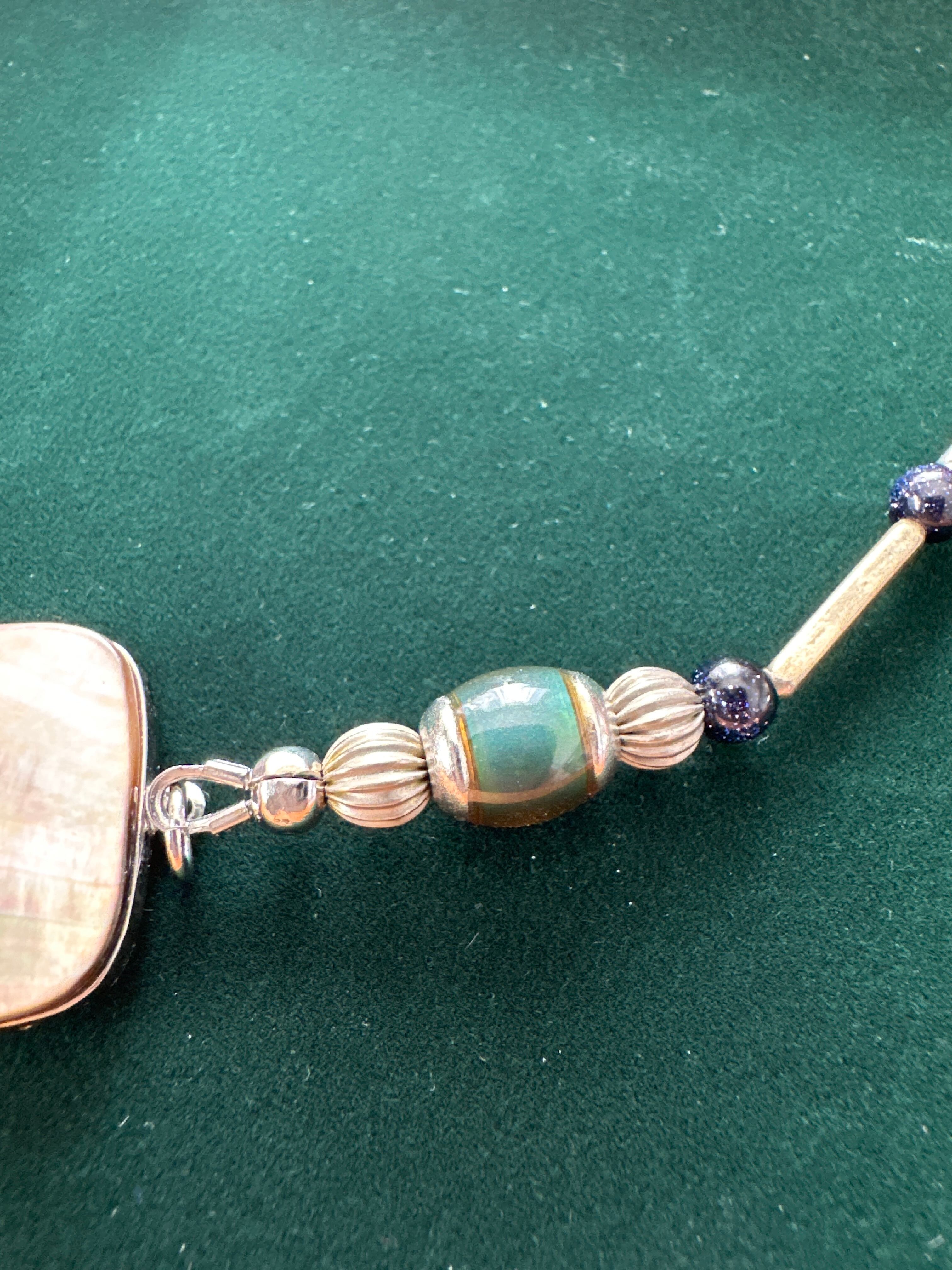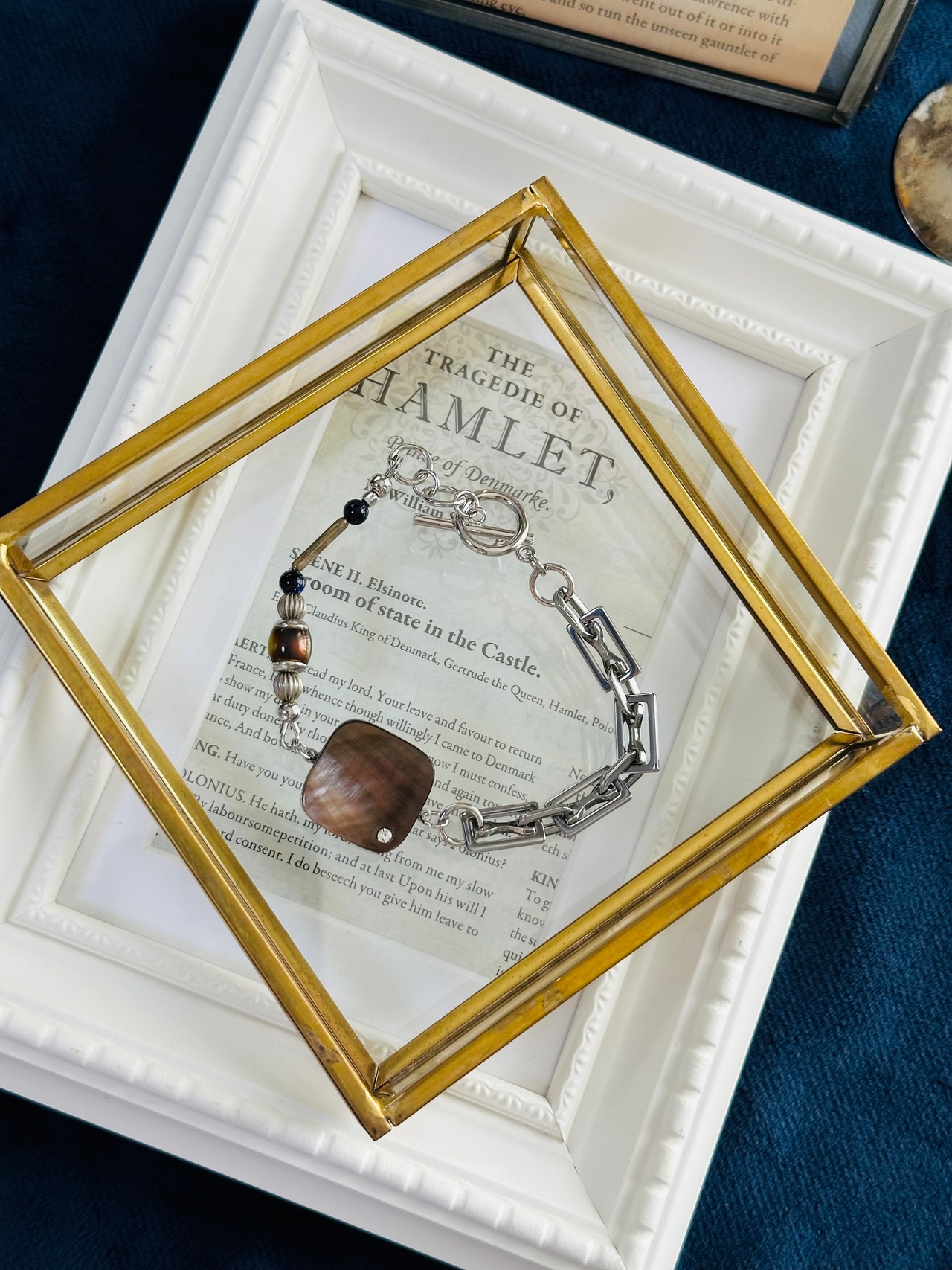 スクエアのシェルボタンとミラージュビーズ、メタルチェーン、メタルビーズを繋げて作ったブレスレットです。