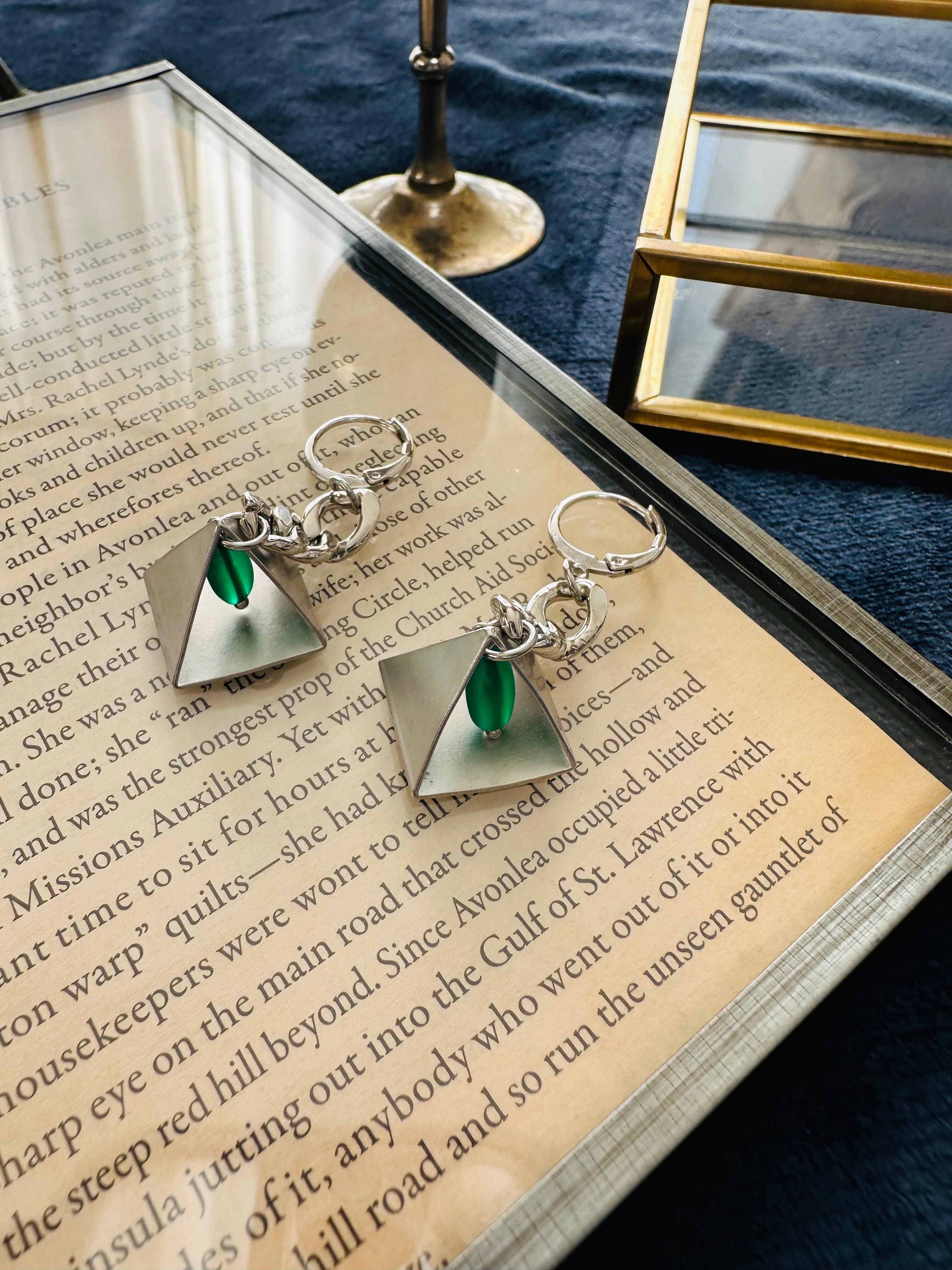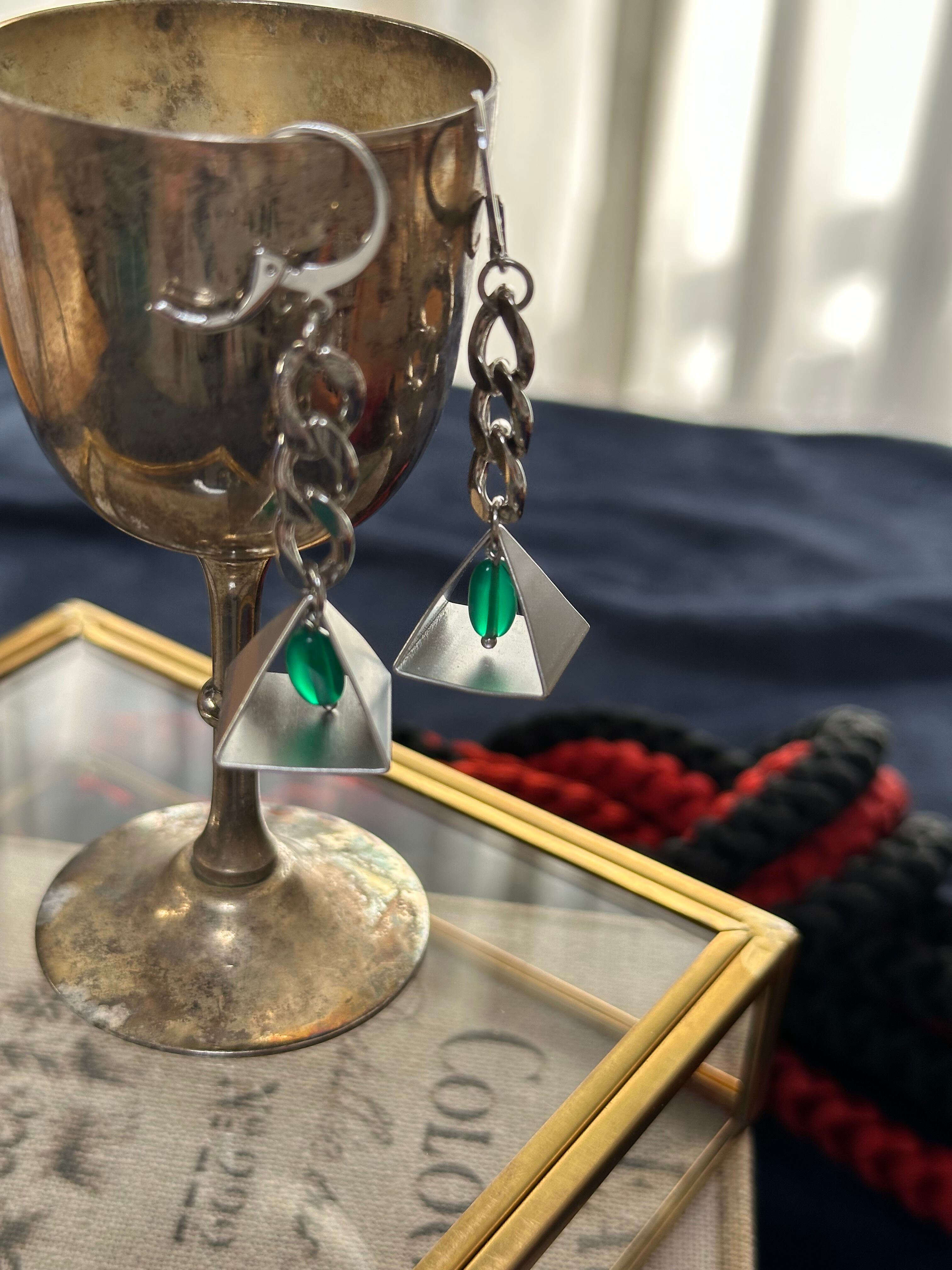 マットなピラミッド形のメタルパーツと半貴石グリーンメノウ、チェーンを組み合わせて繋げて作ったピアスです。